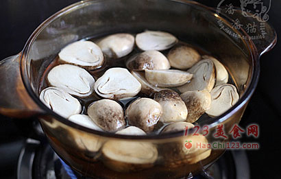 3、买来的草菇洗净,用刀切掉蒂,对半切开后用开水焯透后备用。