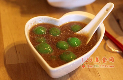 15、把糯米面团揉成一个一个的小圆子放入开水中,煮熟后我在里面又加了椰浆和朋友送的玫瑰花酱。