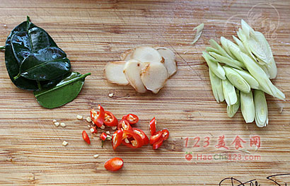 6、把香茅的根部斜刀切成片,香茅有股很特别的清香,我很喜欢,每次喝冬阴功汤的时候无意间遇到它,我还会用牙齿咬一下,因为留恋他的味道。不过我爸爸就不喜欢它的味道,他说有股香皂味,哈哈。南姜切成片,如果买不到这味调料也可以用家里普通的姜替代。柠檬叶子是我很喜欢的一种香草,用手揉搓后会散发出沁人心脾的柠檬味,这味没有也不用强求。小米辣切片,青柠檬取汁。