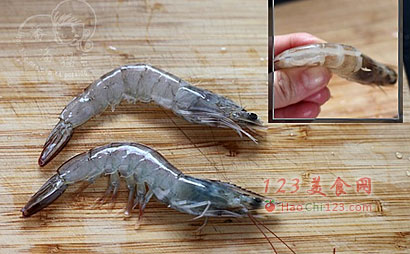 2、海白虾洗净后剪掉两根须子,虾头上的那根刺,身下的足,并剪开虾背,挑出沙线。