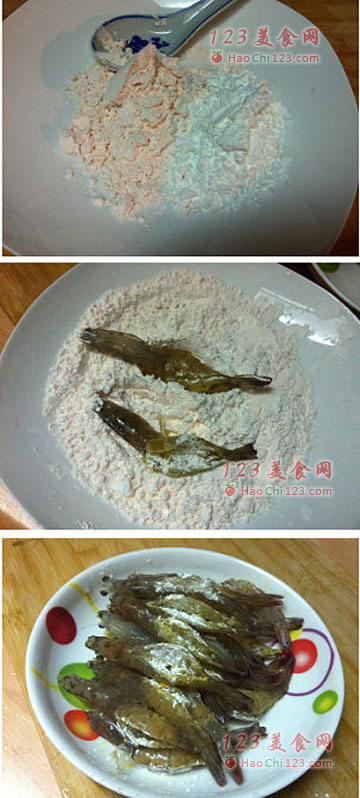 2、2汤匙吉士粉和2汤匙玉米淀粉混合后,逐个将切背后的明虾有虾肉的部分沾上混合粉。