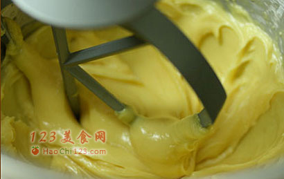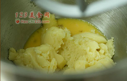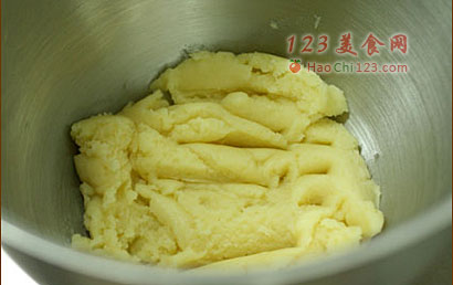 2、将室温软化的黄油打软后,加入糖粉搅匀(图1,搅匀即可,不打发)。