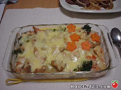 3.做法:往烤盘子里放入准备好的菜料,浇好酱汁儿;再放一些拉丝奶酪,入200度的烤箱烤7~8分,出炉。