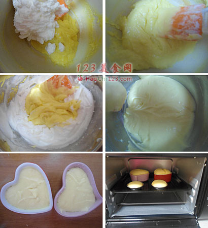 13、14、取1/3蛋清到第7步的面糊里,翻拌均匀后。
