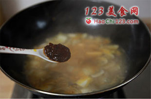 3、取一炒锅,放油烧热,爆香蒜蓉,接着放入泡菜翻炒约1分钟,倒入刚才氽蛤蜊的原汤,放入蘑菇烧开;烧开后放入豆腐,小心的翻动以免豆腐碎掉,调入2汤匙黄豆酱,1汤匙左右韩式辣酱(不喜吃辣可以不放,量随自己口味增减),再尝尝咸淡,适当放盐。