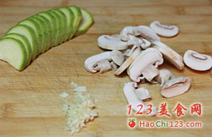 1、所有食材清洗干净,虾剪去虾须;西葫芦切成厚片,蘑菇切片,蒜切蒜末。