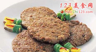 4、混合准备好的佐料和糯米面,牛肉,大酱。撒匀整芝麻做成直径10cm,厚1-2cm的圆饼在蒸笼里蒸出来后晒干。
