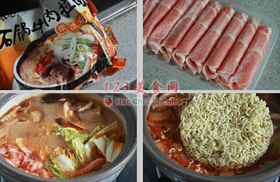 贴士:部队锅的来源是韩战之后,因为肉食短缺,居民们把剩下的香肠,罐装火腿加上辣椒酱煮成一锅食用。现在在韩国仍然很流行。原始的部队锅是没有方便面的,现在么,如果没有方便面就不叫部队锅了吧?维基百科台湾版说,部队锅是没有任何健康益处的食物。嗯,天天谈营养,但是偶尔解解馋没什么不可以的。