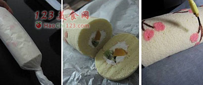 17、再倒扣于另一油纸上,均匀抹上打发的奶油。