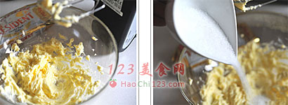 2、分3次加入白砂糖,用电动打蛋器打至发白。