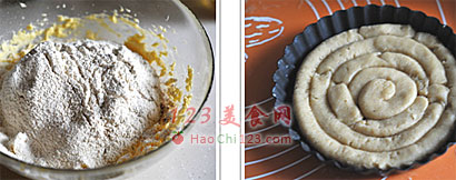 6、用1cm左右的花嘴,围绕模具挤出面糊。