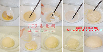 3、不同的面粉吸水性不同,奶的量可以增减10ml,揉面团时一开始是面糊状,一定要有耐心从面糊揉成出筋的面团,不能一直加干面粉;同理,加入融化的黄油时要耐心揉到面团完全吸收黄油至扩展阶段,此过程绝对不能加干面粉。