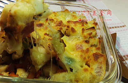 6、把超好的馒头丁,放入耐高温的器皿中,上面铺上一层马苏里拉奶酪。