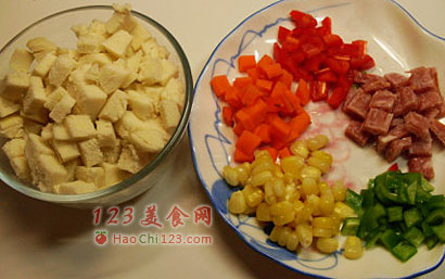 1、馒头切丁;胡萝卜洗净切丁;青红椒洗净,去蒂和籽,切小块;熟玉米剥下玉米粒;培根切小块。