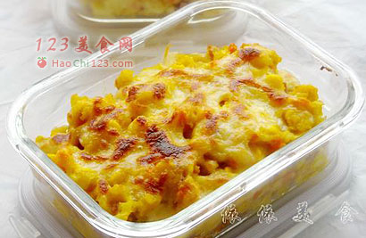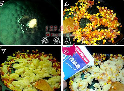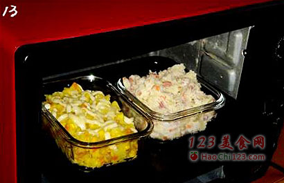 11、把炒好的咖喱腊肠土豆泥装进耐热容器中。