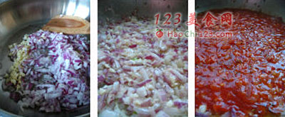5、放入B料,小火翻炒均匀,边熬煮边搅拌,至浓稠,关火即可(如果烹煮肉酱意面,则需要再备一点牛肉末或猪肉末,可在爆香蒜末和圆葱丁之后,倒入肉末炒变色,并倒入番茄酱继续后面的步骤)。