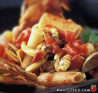 2、把留在锅里的汤重新煮沸,然后把意大利切面放在汤里,根据包装上的说明把切面煮熟,然后捞出,沥干水份。放在冷水中浸泡一会儿使面条全部冷却,然后再次捞出沥干;