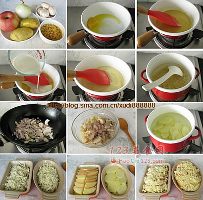 7、苹果带皮切成和土豆同样厚薄的片,铺在土豆上。