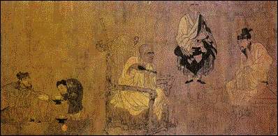 描绘宫廷仕女坐长案娱乐茗饮的盛况。图中12人,或坐或站于条案四周,长案正中置一大茶海,茶海中有一长炳茶勺,一女正操勺,舀茶汤于自己茶碗内,另有正在啜茗品尝者,也有弹琴、吹萧者,神态生动。