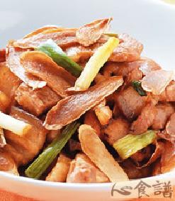 3.热锅,倒入2大匙沙拉油,放入作法1的三层肉片炒至变色,再放入葱段与作法2的嫩姜片炒香。