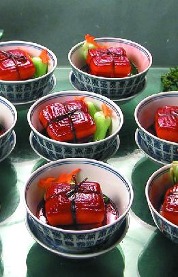 5、客人点菜时,取一块五花肉放入碗中;锅内放原汤100克,小火烧开后勾湿淀粉芡,淋明油出锅,浇在五花肉上,用菜芯点缀即可。