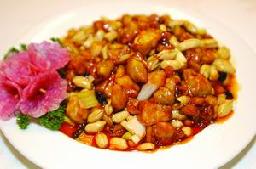 宫保鸡丁,四川传统名菜。由鸡丁、干辣椒、花生米等炒制而成。传说是清末宫保丁宝桢的家厨创制而得名。特点是鲜香细嫩,辣而不燥,略带甜酸味道。 丁宝桢是贵州平远(今织金)人,清咸丰进士,讲究烹调,任山东巡抚时,曾雇用名厨数十人为家厨,请客时常有"炒鸡丁"一菜。后调任四川总督,便将此菜引进四川,与四川嗜辣的习俗相结合,并加以改进,以此宴客,倍受欢迎。后烹制方法泄露出去,为餐馆采纳经营。丁宝桢曾被清朝封为太子少保(尊称宫保),此菜被人命名为"宫保鸡丁"。现已风靡全国。各地的品种略有差异,并有将鸡丁演化为肉丁的宫保肉丁等。