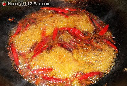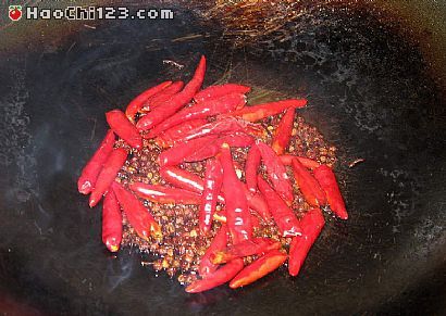 2。将锅内放油,油六成热时放入花椒,辣椒爆香。