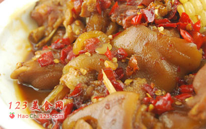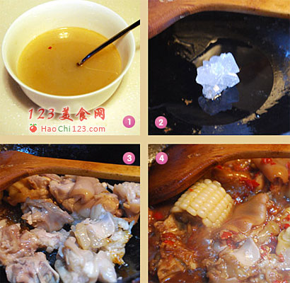 4、见微微上色后,烹入老抽,放入2大勺剁椒,快速翻炒几下后,淋上腐乳汁,约没猪蹄一半左右的位置,喜欢的话可以加上玉米(图4)。