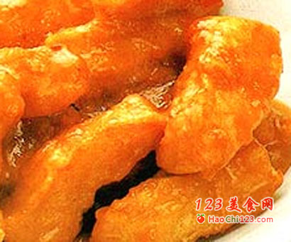 3、炒锅置旺火上,下菜油烧至120℃,将肉条逐一放入锅中炸定型捞出,待油温升至约150℃时,再将肉条放入炸至外酥色金黄时捞出,滗去炸油。