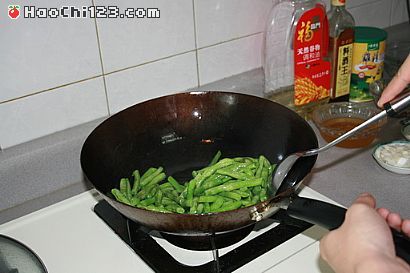 6、豆瓣炒好后,将豆角倒入锅中,加盐、鸡精(芽菜和豆瓣都有咸味,所以盐要少放些)。