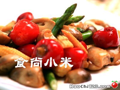 2、将芦笋、玉米笋、草菇分别潮水捞出待用。