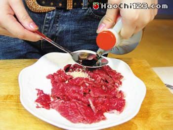 2、用生粉腌制的牛肉片,下锅时要洒少许水拌炒,避免牛肉粘锅。
