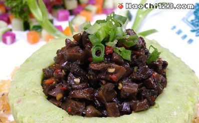 操 作: 将鲜蚕豆蒸熟后打成茸,用模具做成盏型,老盐菜切颗,小米辣切颗,锅内放少许油炒香,装入豆盏中,虾皮用微波炉加热10秒钟,取出撒在豆盏四周即成。