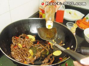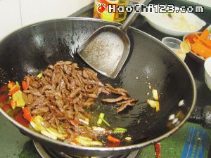 4、烧热2汤匙油,以小火炒香姜片、葱白和指天椒,加入1汤匙辣椒粉、1汤匙花椒粉和2汤匙清水炒匀,倒入牛肉丝拌炒1分钟。