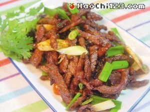 特 色:麻辣牛肉丝是一道四川著名小吃,成菜色泽红润,麻辣味浓,是佐酒下饭的佳品。四川美女嘉嘉在烹饪过程中,直接跳过水煮牛肉的步骤,而是将牛肉切丝下锅油炸至微焦,再与花椒粉、辣椒粉等拌炒成菜。此法一来可保持牛肉软嫩鲜香的口感,二来吃时不会太干身和易上火。