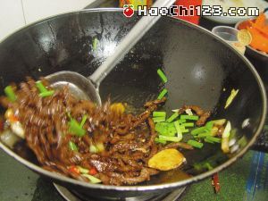 3、烧热1碗油,倒入牛肉丝以中火炸5分钟,炸至牛肉丝干身微焦,捞起沥干油。
