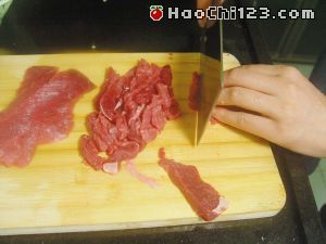 1、牛肉逆着纹理切成丝,加入1汤匙海天金标生抽王、1汤匙料酒、2汤匙生粉、1/3汤匙鸡粉和1/5汤匙白糖抓匀,腌制30分钟。