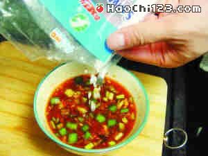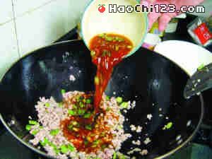 3、调鱼香酱汁时,要一边试味一边放调料,调至酱汁香辣适口便可停手。