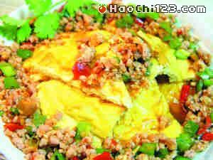 鸡蛋(5只)、猪绞肉(75克)、辣椒丁(1汤匙)、葱花(1/2汤匙)、姜末(1/3汤匙)、蒜末(1/2汤匙)。