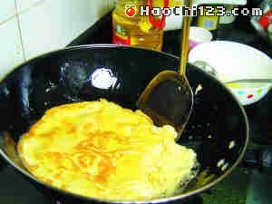 3、旺火烧热干锅,倒入3汤匙油烧热,倒入蛋液煎至双面呈金黄色,盛入碟中待用。