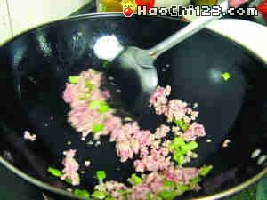 4、烧热1汤匙油,炒香姜葱蒜末和辣椒丁,倒入猪绞肉炒散成肉末,至肉色稍白。
