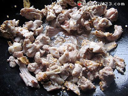 3、下兔肉翻炒,放酱油、调味盐、鸡精、料酒炒香。