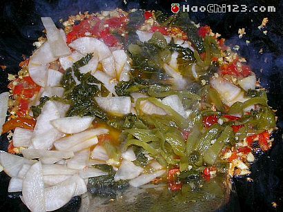 1、泡萝卜切片;泡酸菜切丝;泡辣、生姜、朝天椒、蒜均切末。