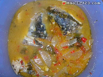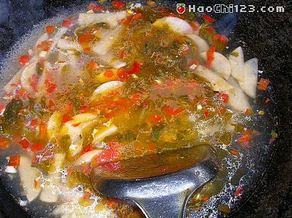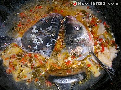 5、下鱼头、料酒、花椒、醪糟汁、盐(极少量,因为泡菜们都有较浓的咸味了)、味精,大火烧沸后改中火烧约八分钟。