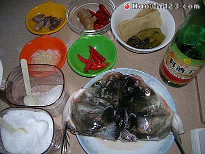 花鲢鱼头一个、剖成两半、泡萝卜二两、泡酸菜一两、泡辣椒八个、泡生姜一块、鲜朝天辣五个、蒜三瓣、花椒约二十粒、醪糟汁两大匙、料酒两大匙、盐、味精适量。