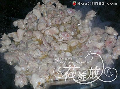 2、当锅中的油回升至七成热时,下兔丁、料酒爆炒至亮油、兔丁呈微黄色。