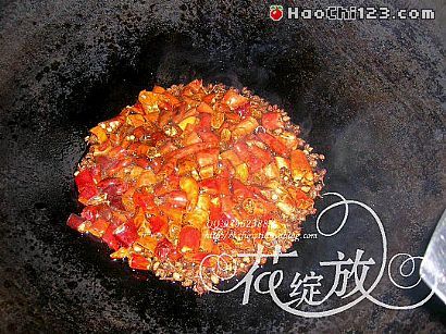 1、锅中放油烧至六成热,下干辣椒段、花椒,稍炸后捞出待用。