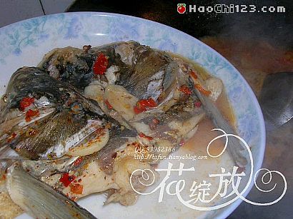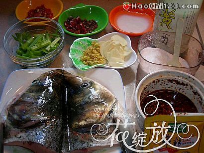 花鲢鱼头一个、砍成两半、泡辣椒八个、切碎、干辣十个、切段、油辣椒三大匙、黄酒两大匙、花椒两匙、老姜一小块、切末、蒜半个、切片、芹菜一两、切段、白糖一匙、淀粉两大匙、加水兑成芡汁、盐、鸡精适量。