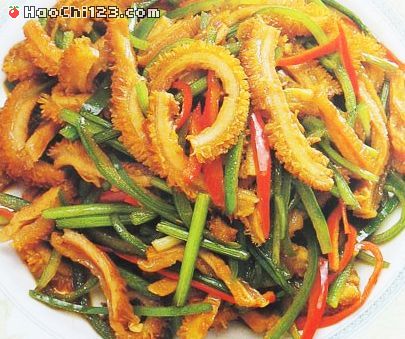 3、炒锅注葱姜油烧热,下入青红椒丝、香菜段略炒,烹料酒,加酱油、味精、盐、牛肚、炒匀出锅即成。