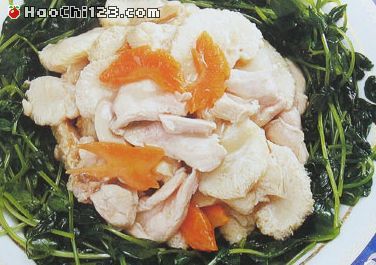 3、锅内注油,下入豆苗炒熟,调味淋入花椒油盛入盘四周;另起锅下葱姜爆香,烹料酒,下入猴头蘑、鸡胸肉、胡萝卜料花,加清汤、盐、胡椒粉略烧,勾芡,盛在盘内豆苗中间即成。